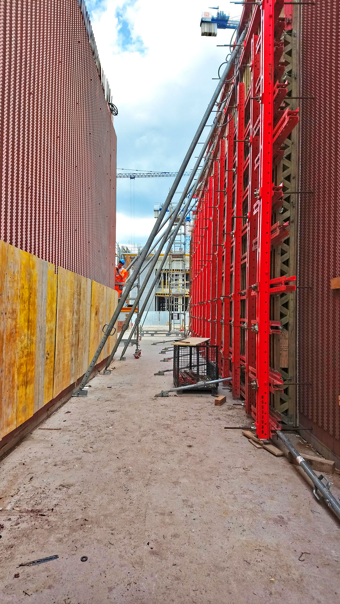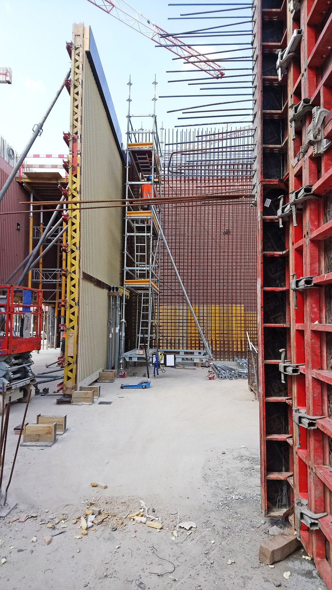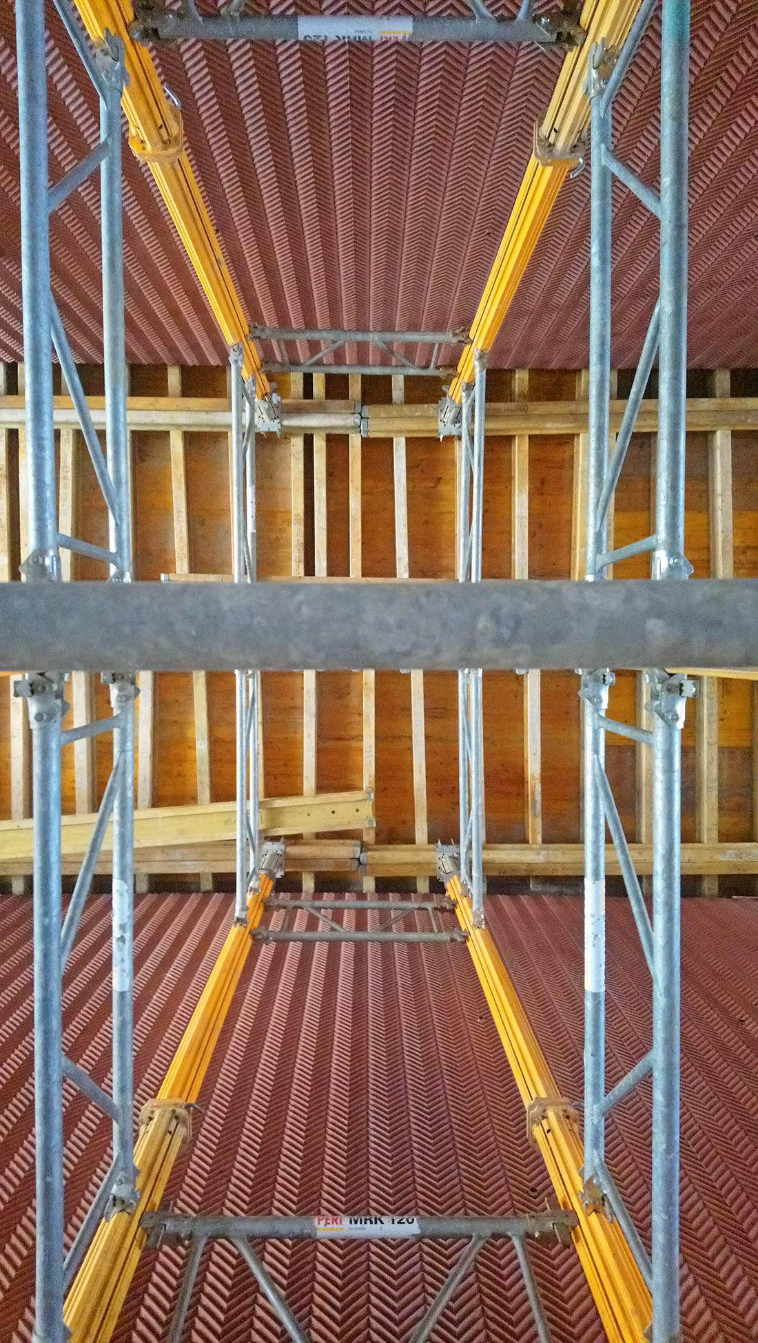 Przed rozpoczęciem budowy została opracowana dodatkowa dokumentacja warsztatowa, w której trasy instalacji zostały zharmonizowane. Konkretne rozwiązania były, w porozumieniu z generalnym wykonawcą, wiele razy zmieniane, korygowane i udoskonalane. Zdając sobie sprawę ze skomplikowania projektu, architekci sprawowali pieczę nad wszystkimi etapami powstawania dokumentacji technicznej, a następnie nad wszystkimi etapami wykonawstwa. Sprawując nadzór autorski, wykroczyli, z własnej inicjatywy, poza standardowy, umowny zakres obowiązków. Ponadto, na etapie budowy brali udział w przygotowywaniu i zamykaniu szalunków, wbudowywaniu mieszanki i rozszalowywaniu gotowych elementów. Wymagało to prawie codziennej obecności projektantów na budowie. Odcisk przestrzennego ornamentu powstał na matrycach (przytwierdzonych do szalunków wysokich na 735 cm). Były to prawdopodobnie najwyższe tego typu elementy użyte do betonowania, zastosowane jak dotąd na budowach w Europie. Jak wspomniano, szczególnej staranności wymagało wykonanie narożników. W tych miejscach niekończący się ornament musiał być idealnie dopasowany, aby płynnie, bez przesunięć przejść na kolejny element. Projektanci nadzorowali jednocześnie kilka ekip wykonujących różne elementy konstrukcji, aby zmniejszyć ryzyko wystąpienia ewentualnych uszkodzeń czy wad powierzchniowych betonu. Ornament musiał być dokładnie odciśnięty; należało też zadbać, aby wielkie płaszczyzny betonowych ścian miały jednolity kolor (bez przebarwień). Równocześnie należało zapewnić drożność skomplikowanego systemu tras instalacyjnych wewnątrz ścian konstrukcyjnych. Na wygląd betonu wpływa (poza określonymi w dokumentacji parametrami i uczciwym wykonawstwem prowadzonym zgodnym z tymi wytycznymi) wiele czynników, których nie da się do końca przewidzieć. Utrzymanie jednolitości wizualnej ściany o długość ponad sto metrów, jest czymś innym, niż uzyskanie tych samych parametrów w skali jednostkowego mock-upu.