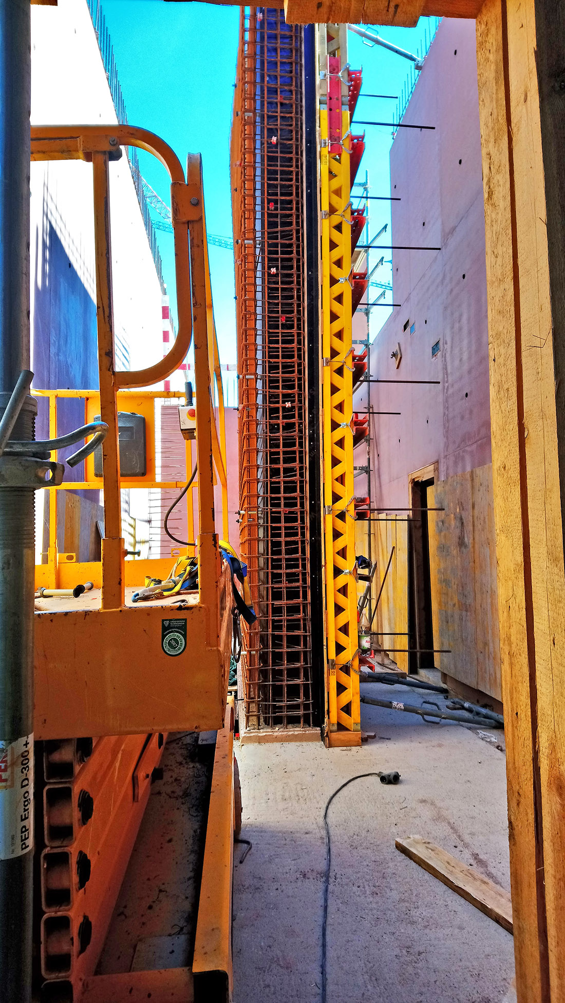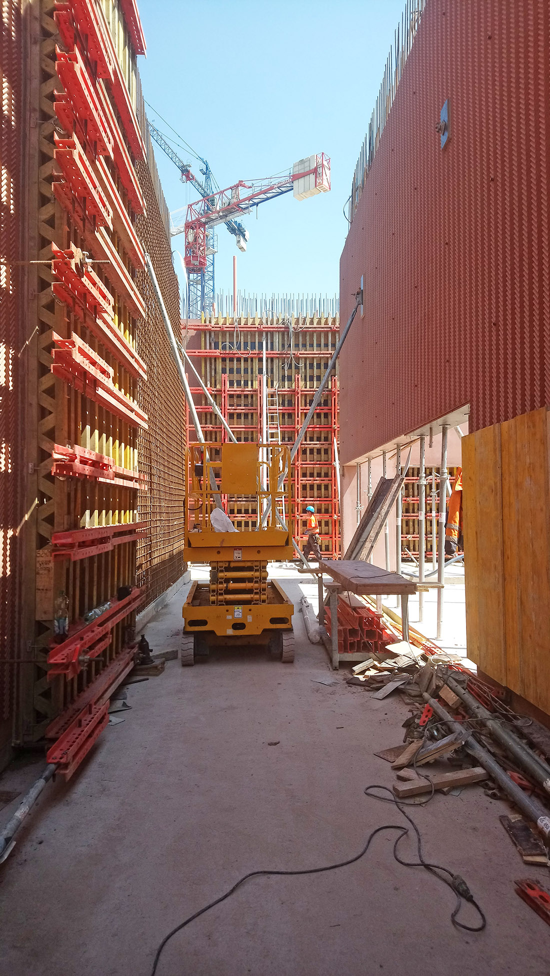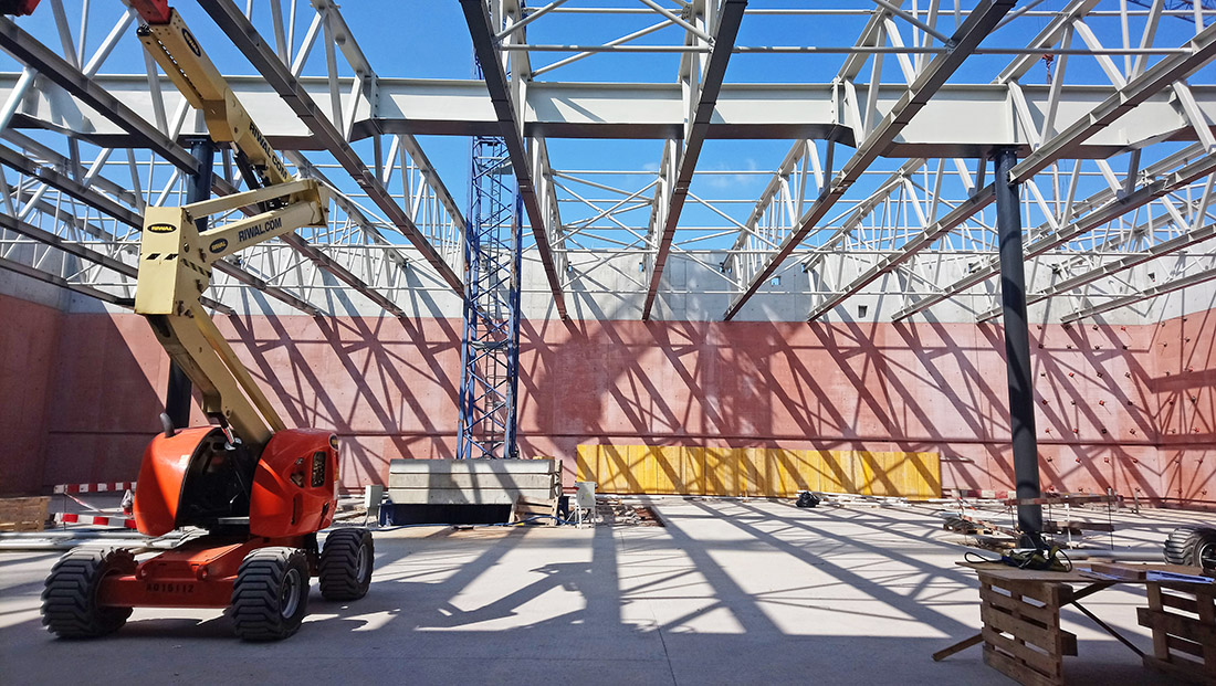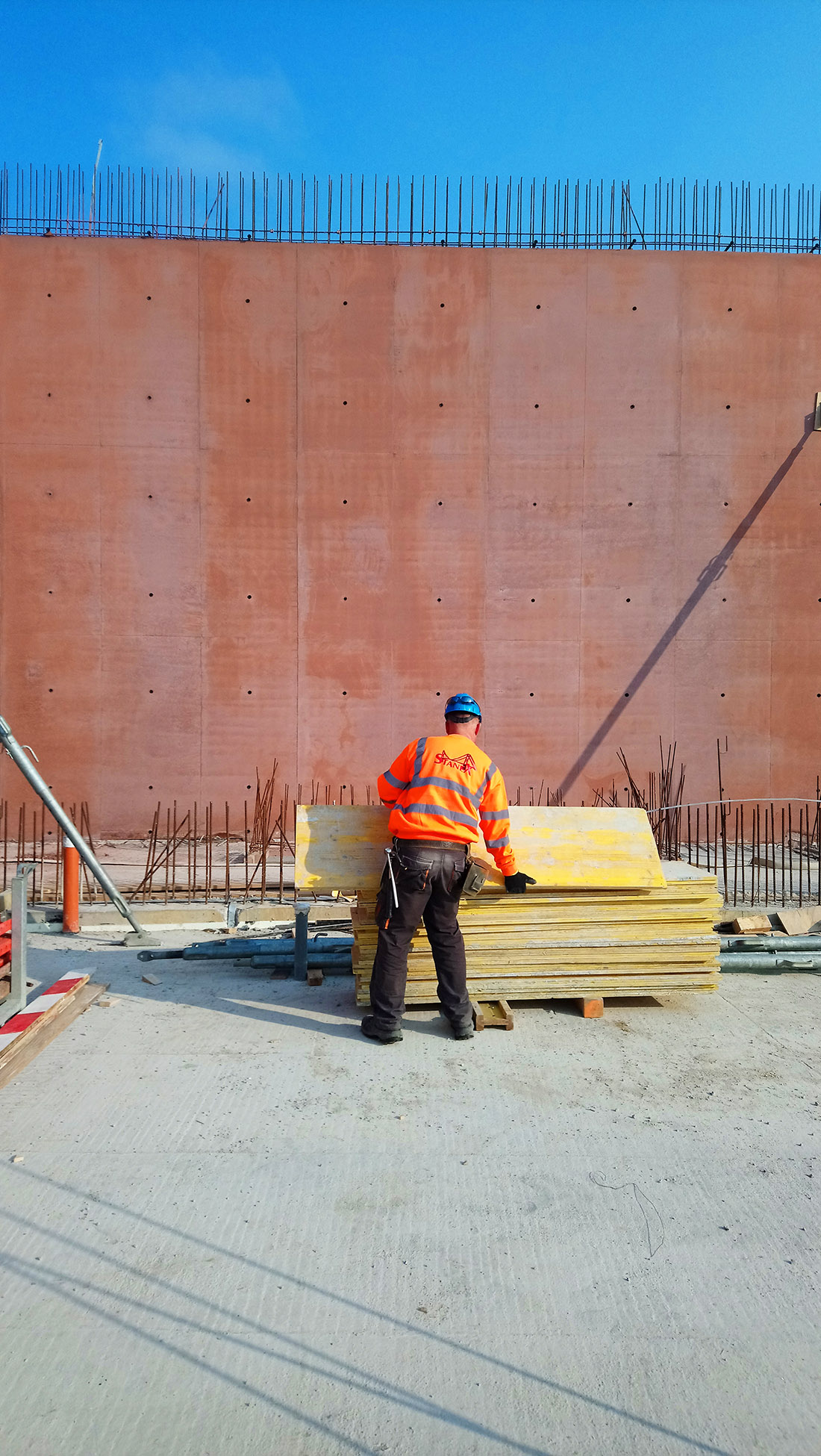 Przed rozpoczęciem budowy została opracowana dodatkowa dokumentacja warsztatowa, w której trasy instalacji zostały zharmonizowane. Konkretne rozwiązania były, w porozumieniu z generalnym wykonawcą, wiele razy zmieniane, korygowane i udoskonalane. Zdając sobie sprawę ze skomplikowania projektu, architekci sprawowali pieczę nad wszystkimi etapami powstawania dokumentacji technicznej, a następnie nad wszystkimi etapami wykonawstwa. Sprawując nadzór autorski, wykroczyli, z własnej inicjatywy, poza standardowy, umowny zakres obowiązków. Ponadto, na etapie budowy brali udział w przygotowywaniu i zamykaniu szalunków, wbudowywaniu mieszanki i rozszalowywaniu gotowych elementów. Wymagało to prawie codziennej obecności projektantów na budowie. Odcisk przestrzennego ornamentu powstał na matrycach (przytwierdzonych do szalunków wysokich na 735 cm). Były to prawdopodobnie najwyższe tego typu elementy użyte do betonowania, zastosowane jak dotąd na budowach w Europie. Jak wspomniano, szczególnej staranności wymagało wykonanie narożników. W tych miejscach niekończący się ornament musiał być idealnie dopasowany, aby płynnie, bez przesunięć przejść na kolejny element. Projektanci nadzorowali jednocześnie kilka ekip wykonujących różne elementy konstrukcji, aby zmniejszyć ryzyko wystąpienia ewentualnych uszkodzeń czy wad powierzchniowych betonu. Ornament musiał być dokładnie odciśnięty; należało też zadbać, aby wielkie płaszczyzny betonowych ścian miały jednolity kolor (bez przebarwień). Równocześnie należało zapewnić drożność skomplikowanego systemu tras instalacyjnych wewnątrz ścian konstrukcyjnych. Na wygląd betonu wpływa (poza określonymi w dokumentacji parametrami i uczciwym wykonawstwem prowadzonym zgodnym z tymi wytycznymi) wiele czynników, których nie da się do końca przewidzieć. Utrzymanie jednolitości wizualnej ściany o długość ponad sto metrów, jest czymś innym, niż uzyskanie tych samych parametrów w skali jednostkowego mock-upu.