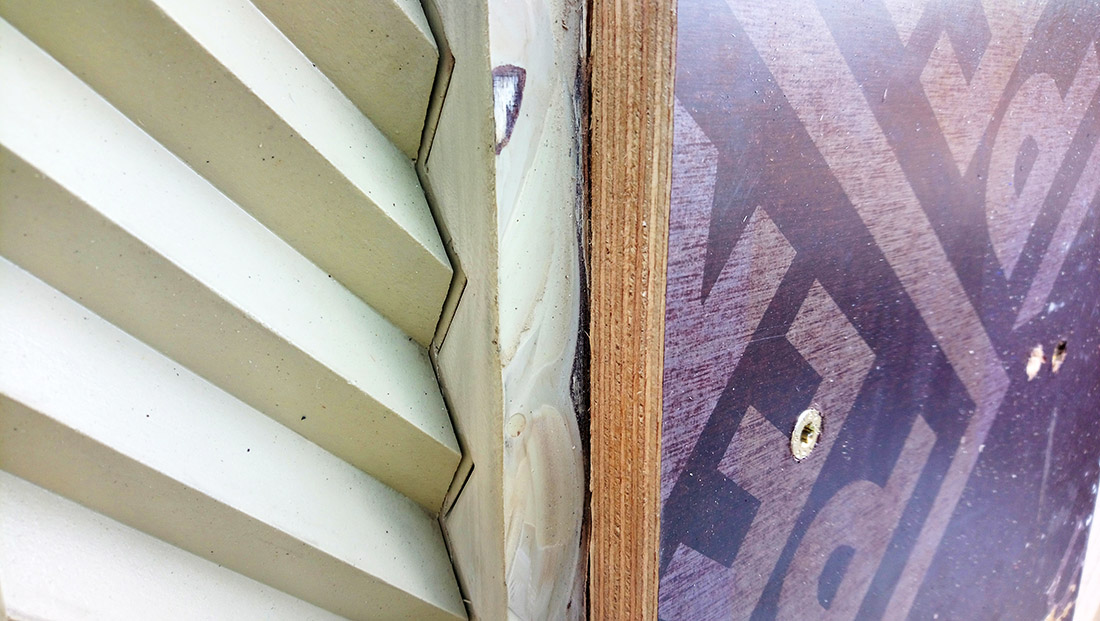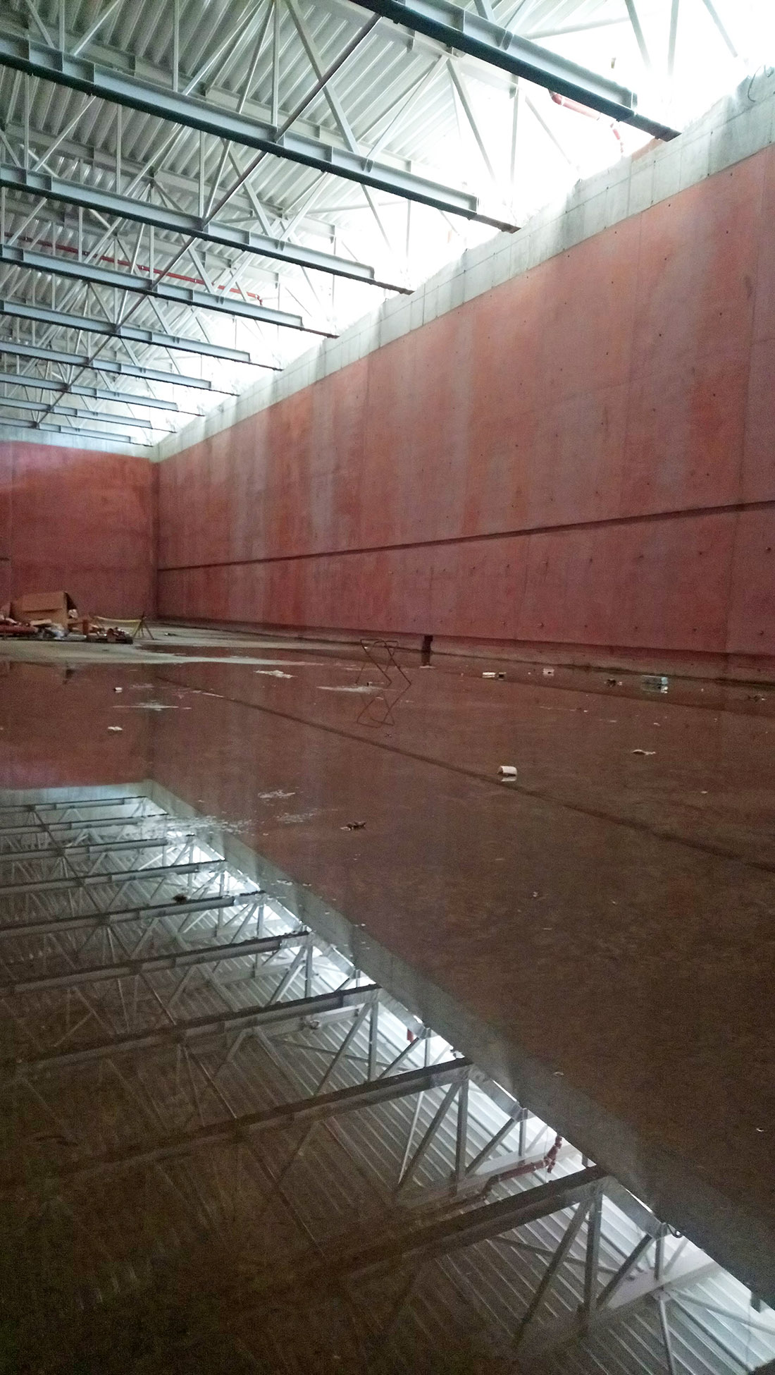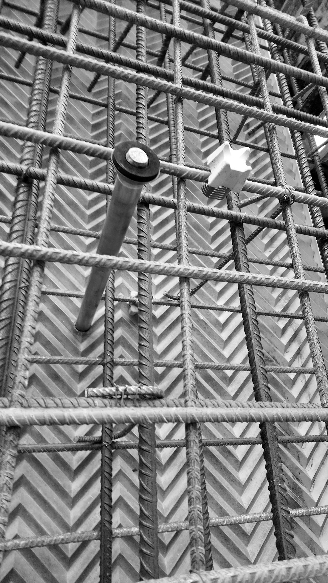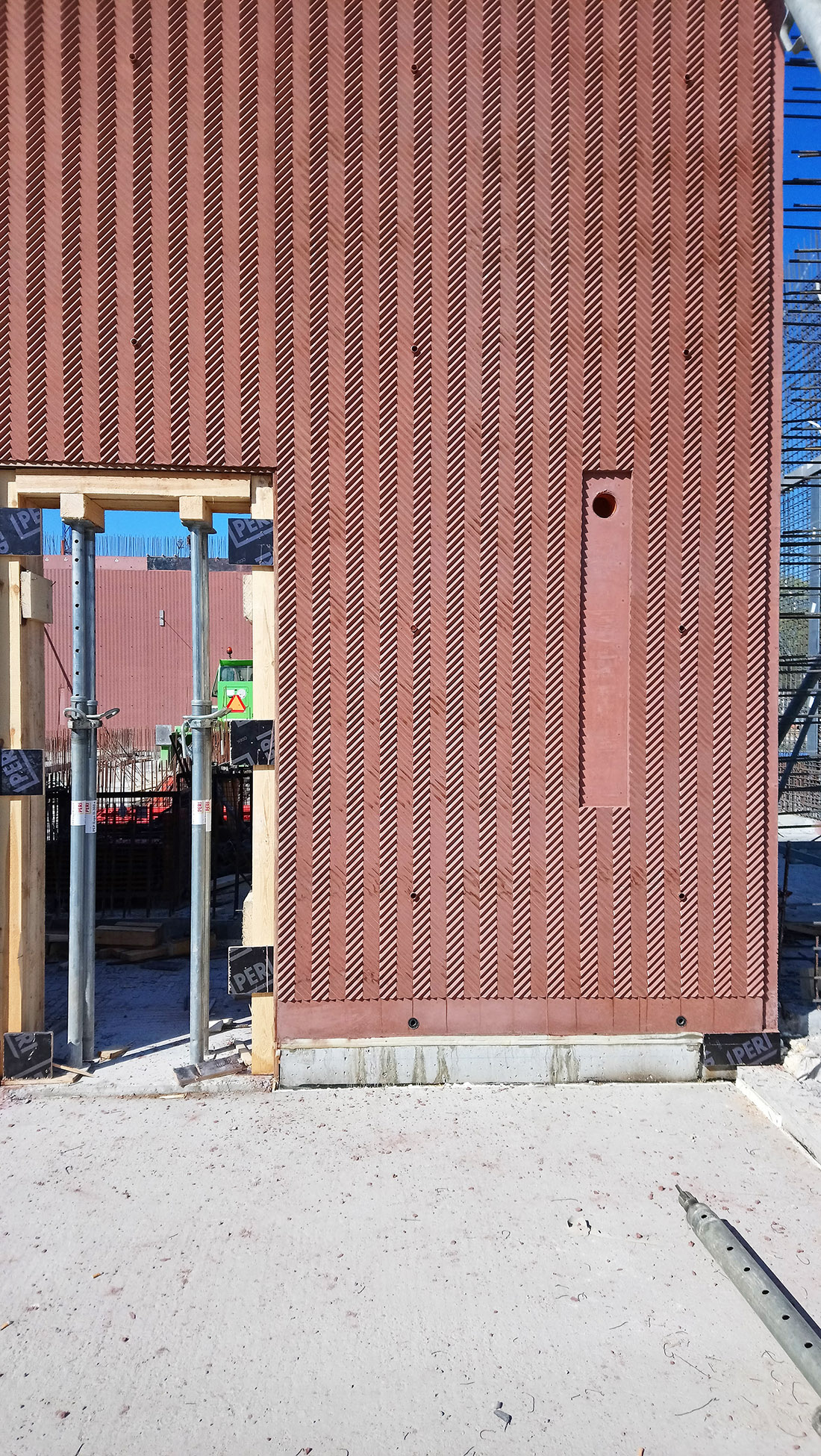 Podsumowując, przed przystąpieniem do prac budowlanych najpierw odlano i zbadano dziesiątki małych próbek betonu barwionego w masie. Powstawały wówczas elementy z odciskiem wzoru oraz o gładkiej powierzchni. Sprawdzano fakturę, kolorystykę, jakość odwzorowania szewronu, efekty po naniesieniu środka antygraffiti. Następnie wykonano dwa duże mock-upy. W efekcie wybrano do realizacji beton architektoniczny kategorii BA3 (według opracowania „Beton architektoniczny – wytyczne techniczne” Krzysztofa Kuniczuka). Zastosowano mieszankę o zabarwieniu 5% barwnikiem Schomburg B-63, o pigmentach na bazie tlenków żelaza. Cały beton wyprodukowany na budowę pochodził od jednego producenta, firmy Lafarge. Doświadczenia wyniesione z budowy mock-upów miały również ułatwić podjęcie decyzji związanych z konstrukcją budynku i zagadnieniami instalacyjnymi. Szczególnie te drugie okazały się trudne zarówno na etapie projektowym, jak wykonawczym. Założeniem mającym pomóc w uzyskaniu czystości architektonicznej formy było ukrycie tras instalacyjnych wewnątrz betonu (prawie wszystkie instalacje zostały poprowadzone w grubości ścian konstrukcyjnych).