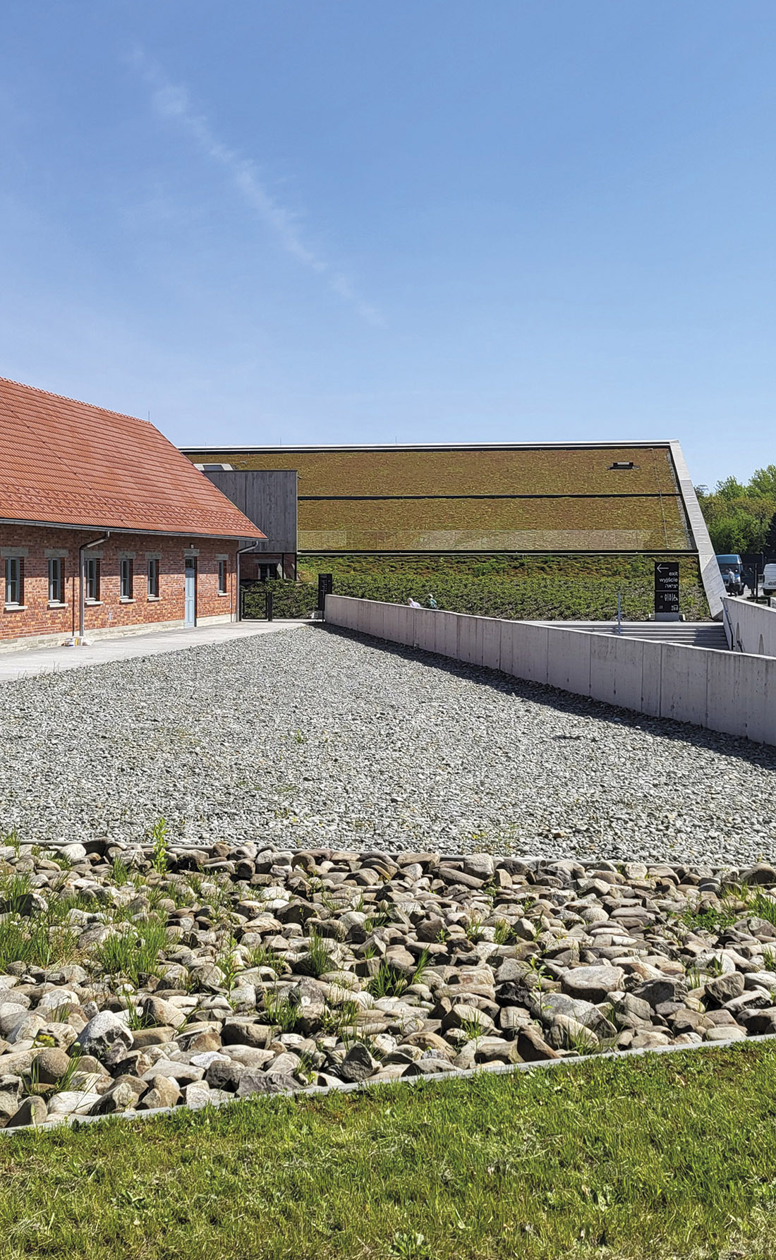 Po około dwóch godzinach wracają do centrum obsługi drugim betonowym tunelem. Wyjście jest krótsze niż wejście i streszczone na mniejszej przestrzeni. Betonowa ścieżka zamienia się w tunel na krótkim odcinku pod ulicą i kończy zaraz za nią. W tym miejscu stajemy się świadkami znakomicie zaprojektowanego rozwiązania przestrzennego. Przed wychodzącymi z tunelu staje przed oczami podnosząca się ku niebu zielona płaszczyzna, jako drugi plan, zaraz za widoczną na pierwszym planie ceglaną fasadą rzeźni. Płaszczyzna zielonego dachu należy do hostelu, którego wielka kubatura, co ważne, mogła łatwo przytłoczyć historyczny, więc najważniejszy obiekt. Szczęśliwie tak się nie stało. Fasada hostelu od tej najważniejszej strony zamienia się w kompozycję krajobrazowo-przestrzenną. Wrażenie jest jeszcze silniejsze, gdy porówna się ze sobą dwie fasady tego samego budynku: pochyłą krajobrazową od strony obozu i drugą, po przeciwnej stronie obiektu. Ta druga ściana, przebita oknami pokoi, zrobiona z ciężkich prefabrykatów, posiada cechy nieomal monumentalne.
