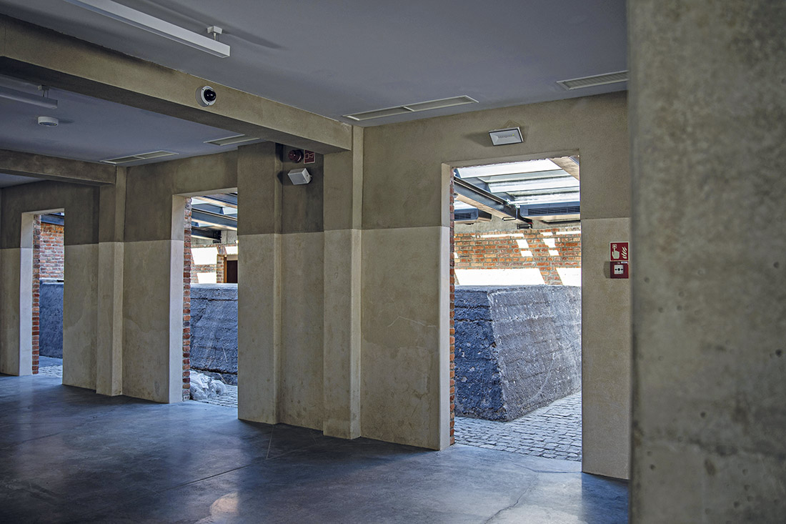 Drogę, prowadzącą na teren obozu, pokonuje się w kilku etapach. Przyjezdnych wita nowy budynek bramny albo uzupełniający. Należy on do kilku betonowych konstrukcji, które pełnią funkcję informacyjną i organizacyjną centrum obsługi. Z budynku bramnego prosta droga prowadzi do jedynego świadka historii, jedynego ocalałego obiektu w całym założeniu. To była rzeźnia (Schlachthaus) i mleczarnia (Molkerei). Jest to również jedyny obiekt, którego elewacje zostały zbudowane z czerwonej cegły. W toku prac konserwatorsko-budowlanych elewacjom przywrócono najbardziej prawdopodobny charakter z okresu okupacji. W żadnych innych obiektach kubaturowych czy inżynierskich, zbudowanych na potrzeby centrum obsługi, nie została użyta cegła. W sposób rygorystyczny i czytelny podkreślono rangę historycznego budynku na tle betonowej szarości nowych kubatur. Nie trzeba dodatkowych objaśnień, tablic informacyjnych ani specjalistycznej wiedzy, aby zorientować się w przyjętej hierarchii; wystarczy rzut oka na bryłę i kontrastująco dobrane materiały. Sens rozwiązania jest czytelny dla każdego. Z kolei we wnętrzach byłej rzeźni przeważa beton historyczny, teraz wydobyty na powierzchnię spod farb, okładzin i naleciałości. Betonowy sufit w poczekalni trzeba nazwać zjawiskowym (ze świadomością, że stosowanie kategorii estetycznych w obliczu miejsca pamięci może zostać uznane za niestosowne…). Strop wcześniej nie był zabudowany; był elementem struktury, która, jak mówią architektki-współautorki projektu centrum obsługi odwiedzających, od pierwszej chwili zrobiła na nich duże wrażenie. Podobnie jak betonowa konstrukcja hali, żelbetowe kolumny i podziemne hale mroźni i chłodni. To tu zrodził się zamysł, aby strukturę budynku pokazać w pierwotnym stanie na tyle, na ile będzie to możliwe. Na parterze i w piwnicach zakonserwowano warstwy lastriko z różnych okresów życia budynku. Jest też historyczna cegła i stalowa blacha w dwóch fakturach. W piwnicach, w okresie funkcjonowania obozu, mieściły się chłodnia i mroźnia. Schodząc do piwnic, po drodze mijamy betonowy bunkier amunicyjny, który sam w sobie jest historyczną ciekawostką. Powstał jeszcze przed drugą wojną światową, gdy w Oświęcimiu stacjonowali polscy żołnierze. W tym miejscu trzeba przypomnieć, że niemiecki obóz koncentracyjny Auschwitz I powstał w oparciu o 22 murowane budynki, zbudowane jeszcze w okresie zaboru austriackiego, a po odzyskaniu niepodległości przejęte przez Wojsko Polskie. Bardzo charakterystyczne, znane z filmów i reprodukcji obozowe baraki, w większości nie były dziełem hitlerowców. Budynek rzeźni i mleczarni powstał przez swoistą nadbudowę lub obudowę istniejącego bunkra. Mijając grube mury tej konstrukcji, schodzimy do piwnic, a dalej, po przekroczeniu solidnej stalowej bramy, kontynuujemy drogę podziemnym tunelem.