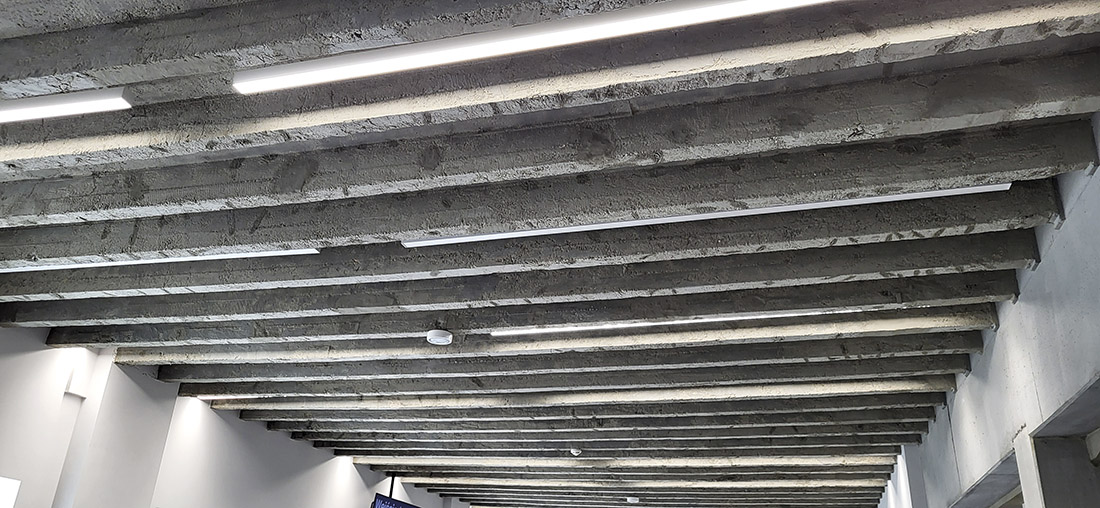 Betonowy strop na parterze, w głównej hali byłej rzeźni obozowej