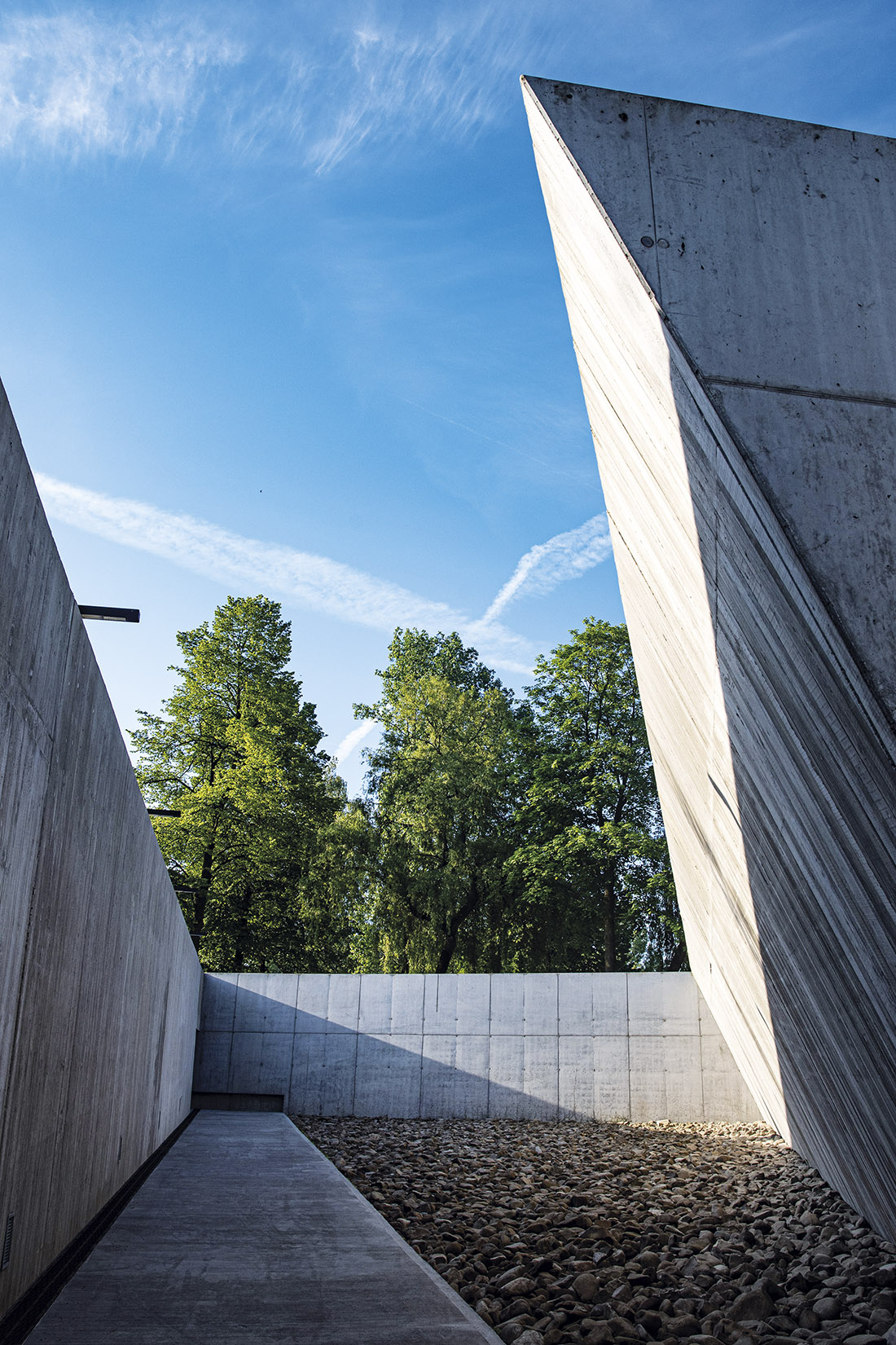 Na hasła „centrum obsługi” albo „strefa wejściowa” przed oczami stają mniej lub bardziej udane rozwiązania w budynkach biurowych, w formie recepcji, drzwi i lepiej lub gorzej urządzonego holu. Z pewnością istnieje katalog wypracowanych zasad, według których tego typu miejsca są projektowane. Z pewnością istnieje tajemnicza korporacyjna wiedza na temat sposobów zachowania się człowieka w przestrzeniach zaaranżowanych według określonych reguł. Centrum obsługi w Muzeum, jak wielokrotnie podkreślano, powstało z potrzeb rzeczowych. Jednak znaczenie miejsca, jednego z najważniejszych miejsc pamięci w świecie, postawiło architektów przed innym zadaniem. Ostrożnie posługując się pojęciem „kreacji”, stworzyli wielowątkowe dzieło rozplanowane na dużej przestrzeni; dzieło bez żadnych bezpośrednich odniesień do obozowych „narracji”. Architektura powstała jako wynik wytycznych, wśród których miały znaczenie tak, zdawałoby się, prozaiczne sprawy, jak odporność ścian na zużycie i przypadkowe uszkodzenie przez setki tysięcy odwiedzających. Pierwszorzędną rolę w tej realizacji ma szary beton. Co ciekawe, nawet w miejscach, w których zostały użyte prefabrykaty, betony nie wyglądają jak tkanina prosto spod igły. Prefabrykaty na północnej fasadzie i w narożnikach hostelu w niczym nie przypominają produktu ze sterylnej taśmy produkcyjnej, sterowanej komputerowo w warunkach laboratoryjnych. Jest wręcz przeciwnie. Są to surowe i ciężkie segmenty z fakturą wyczuwaną pod dotknięciem palców. Do złudzenia przypominają beton wylewany in situ, więc także w tym miejscu projektanci starali się unikać estetyzacji architektury. A sens i symbolika całości? Krótko i trafnie sens inwestycji wyraziła w jednym zdaniu przewodniczka spotkana w Muzeum: „sprawy organizacyjne wyprowadzono na zewnątrz, aby w miejscu pamięci została pamięć”.
