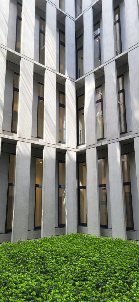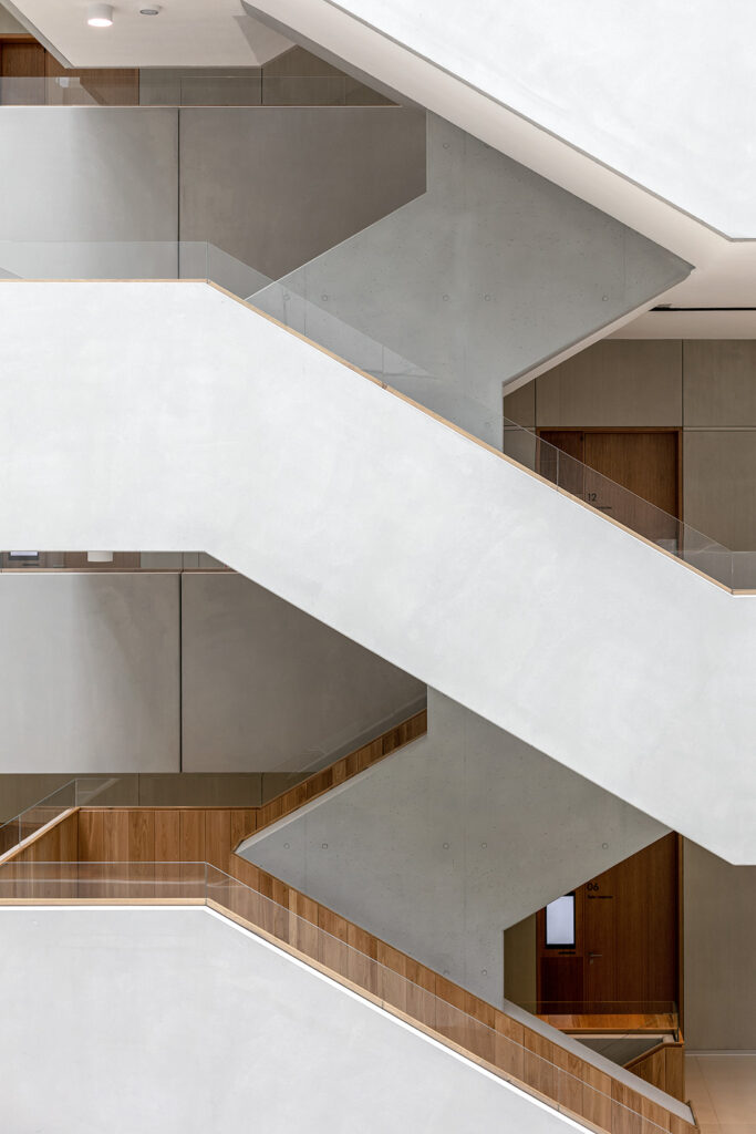 Jak wspomniano, tylko pomieszczenia biurowe na obwodzie budynku mają dostęp do okien. Jak wobec tego funkcjonują sale rozpraw, które zlokalizowano w trzecim wewnętrznym pierścieniu? Aby wprowadzić dzienne światło do pomieszczeń zlokalizowanych głęboko wewnątrz, architekci zaprojektowali system czterech świetlików (po przekątnych kwadratu na planie budynku). W przeciwieństwie do centralnego atrium, które zostało przykryte kratownicą i przeszkleniem, cztery małe patia nie mają żadnych zadaszeń. W studnię dziedzińców wpada nie tylko dzienne światło, ale deszcz, śnieg i przede wszystkim – świeże powietrze. Ponieważ konstrukcje są głębokie (dno dwóch dziedzińców znajduje się na poziomie parteru, dwóch na poziomie pierwszego piętra) naturalna wentylacja obsługuje nawet najniżej położone pomieszczenia. Okna w salach rozpraw wychodzą właśnie na wewnętrzne patia, dzięki czemu pokoje można wietrzyć, a do wnętrz wpada rozproszone światło. Zadaszony główny hol i cztery otwarte studnie tworzą system wspierający wentylację i doświetlający wnętrza. Z kolei sale rozpraw wydają się bardziej kameralne niż są w rzeczywistości, a na pewno mniej opresyjne, dzięki materiałom wykończeniowym o stonowanej kolorystyce. Różne faktury drewnianych wykończeń zostały podporządkowane akustyce, ponieważ obecnie tok czynności procesowych bywa protokołowany w postaci nagrań. Zwracają uwagę detale i formy przestrzeni wspólnych, jak obudowy wind, zabudowa drzwi, świetlne tablice informacyjne (e-wokandy) przy salach posiedzeń, siedziska i balustrady na galeriach. Beton i drewno to dwa główne materiały wykończenia tych wnętrz.