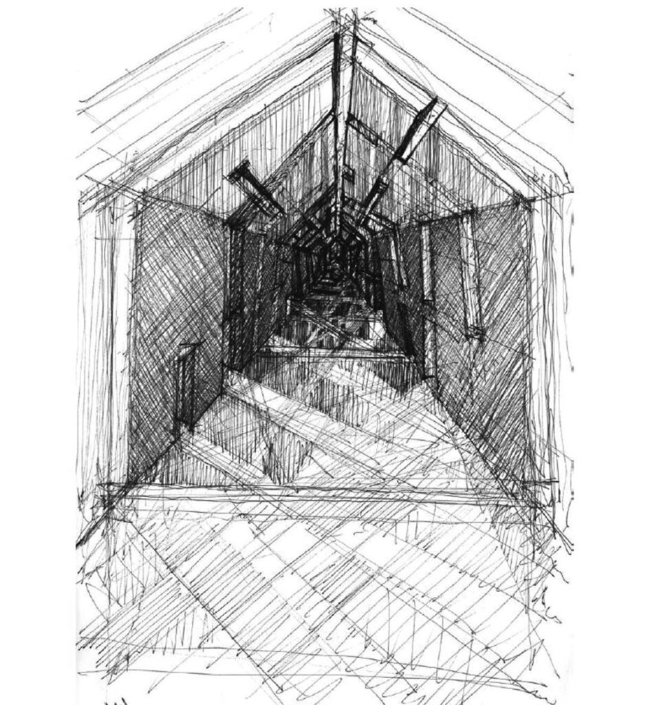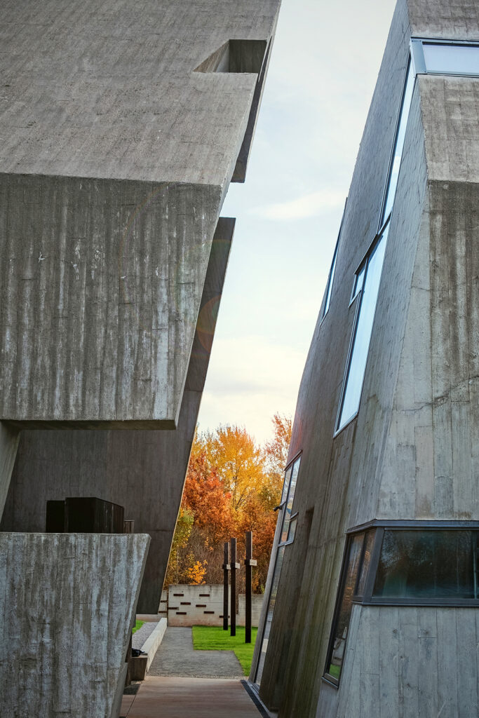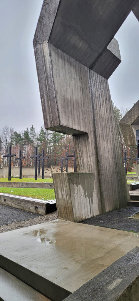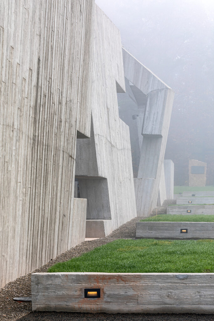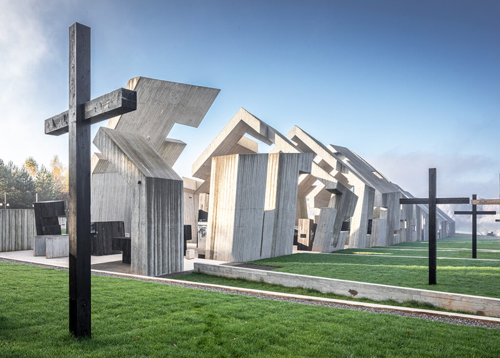 Jeżeli ekspozycja historyczna bezpośrednio przemawia do odwiedzających sekwencją prezentowanych wydarzeń, fotografii, nazwisk i artefaktów, w gruncie rzeczy podobną rolę odgrywa architektura mauzoleum. Następujące po sobie bardzo surowe wnętrza (określenie „sale wystawowe” byłoby może niestosowne) są formami, które zasadniczo różnią się od stabilnie osadzonego w przestrzeni i fundamentach domu ciszy. Betonowe konstrukcje, owe symboliczne stodoły czy chałupy, zostały gwałtownie porozcinane, horyzontalnie i wertykalnie. W ścianach i dachach widać spękania i szczeliny. Wycięcia w bryłach na wysokości człowieka wydają się jeszcze naturalne, ponieważ odwzorowują okna i drzwi. Pozostałe cięcia dynamizują bryły i budzą niepokój, nawet w odniesieniu do stabilności konstrukcji. Szczytowe ściany są porozrywane (wybuchem?), a dachy fragmentarycznie uszkodzone (pożarem?). Interpretacja tych gestów nie jest trudna, przekaz jest jednoznaczny, bardzo bezpośredni. Betonowe domy rozpadają się, chwieją, ulegają destrukcji w wojennej pożodze. W każdej kolejnej formie jest coraz mniej materii (materiału-betonu), a coraz więcej pustki. Formy stają się ekstatyczne; w jednym z ostatnich rozpadających się domów ściana odgina się na zewnątrz w teatralnym geście, uderzona podmuchem wybuchu. Przedostatni dom nie ma kalenicy, a ostatni, jedenasty, jest tylko tym, co pozostaje po wielkim pożarze. Z ziemi wystają ostatki zgliszczy. Ostatnie segmenty mauzoleum prawie dotykają górnej granicy działki, która znajduje się przy ścianie lasu. Przejście przez mauzoleum (zwiedzanie czy pielgrzymka przez kolejne świeckie stacje drogi krzyżowej…?) zostało wyraźnie podzielone na dwie części. Pierwsza część znajduje się pod dachem rozumianym dosłownie. W czterech betonowych domach o jeszcze w miarę stabilnych formach, wszystkie rozcięcia w bryłach, ścianach i dachach zostały przykryte przeszkleniami. Powód rozwiązania jest prozaiczny – komfort zwiedzania o każdej porze roku. Oryginalnym zabiegiem projektantów jest natomiast wyprowadzenie ostatnich sekwencji wystawy poza zamknięte wnętrza. Zwiedzanie mauzoleum nabiera dodatkowego waloru w zimny i deszczowy dzień, kiedy nagle opuszcza się strefę kontrolowanego muzealnego komfortu. Ostatni etap albo epilog zwiedzania odbywa się wśród form, które ukazują daleko idącą destrukcję materii. Dominuje pustka, pozostałość po czymś, co kiedyś istniało. W tych zewnętrznych, niczym nieosłoniętych przestrzeniach, beton konstrukcji, drewno ekspozytorów i czarna stal plansz informacyjnych są wystawione na działanie (zawsze niszczących każdą materię) warunków atmosferycznych. Przestrzeń mauzoleum można interpretować jeszcze inaczej. Na fotografii wykonanej z lotu ptaka wyraźnie widać, jak kręgosłup budynku, zbudowany z jedenastu części, został centralnie „osadzony” w siatce betonowych ścieżek. Te ścieżki trawersują łąkę i prowadzą do betonowych murów zbudowanych na granicy działki; w nich zostały wmurowane pamiątkowe tablice. W swojej mozolnej drodze ścieżki w dziesięciu miejscach „przecinają” budynek i w tych miejscach przewidziano możliwość wyjścia z wystawy na zewnątrz. Istnieje więc alternatywna forma zwiedzania mauzoleum. Polega ona na tym, że po zapoznaniu się z fragmentem ekspozycji opuszcza się budynek, po chwili ponownie do niego wraca, i czynność tę powtarza kilka razy. W tych następujących po sobie bardzo podobnych sytuacjach, powtarzających się gestach i sekwencjach, byłoby coś z ceremonii, pielgrzymkowego rytuału albo przemierzania dróżek kalwaryjskich.